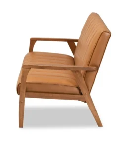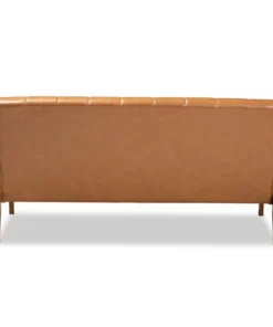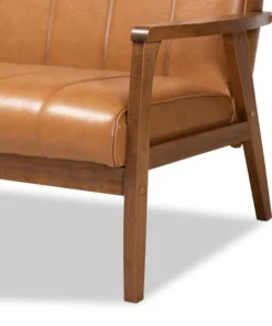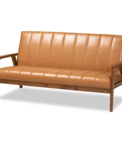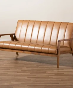 The Nikko sofa is a stunning and eye-catching piece perfect for adding personality to any space. Made in Malaysia, the Nikko is constructed from sturdy wood padded with soft foam and upholstered in smooth, tan-colored faux leather. The angular frame showcases warm walnut tones and features long legs that form ergonomic armrests. Requiring assembly, sleek channel tufting provides unique visual charm while ensuring plush comfort that lasts. With a nod to mid-century design, the Nikko sofa is an ideal accent piece for the modern home.