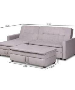 The Noa sofa functions as a sofa, bed, and storage all in one. This living room set consists of a loveseat, chaise, and ottoman, each fitted with a lift-top that reveals ample storage space for extra pillows and blankets. During the day, the Noa is a cozy place to lounge and watch TV. At night, push the ottoman next the chaise and fold down the backs of the chaise and loveseat to create a comfortable bed for overnight guests. Constructed from wood, the Noa is upholstered in a soft, grey polyester fabric that complements a wide range of interior color palettes. Plush foam-padded cushions provide comfort when lounging or sleeping. Biscuit tufting adds a chic, modern look. The Noa sofa requires assembly.