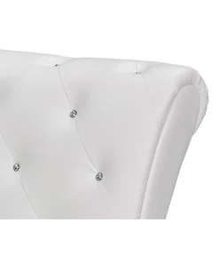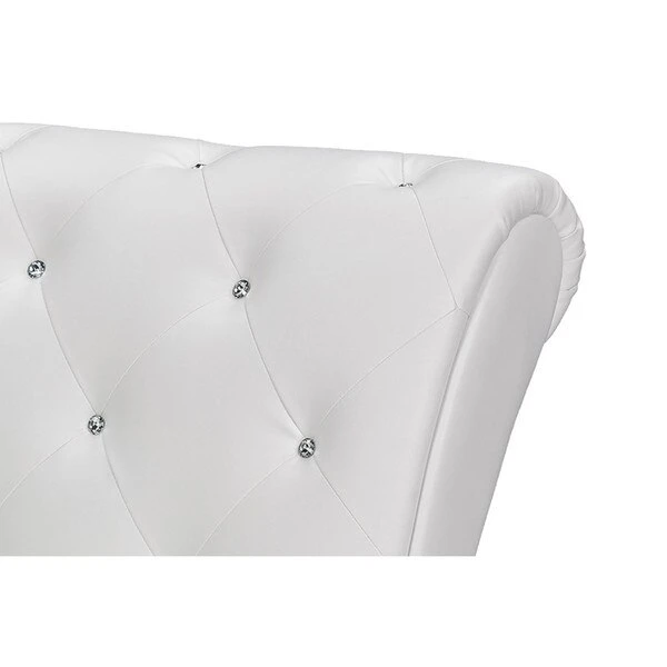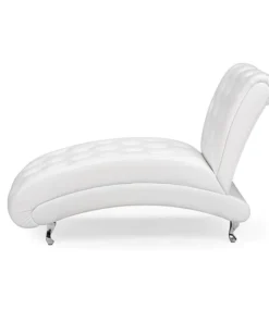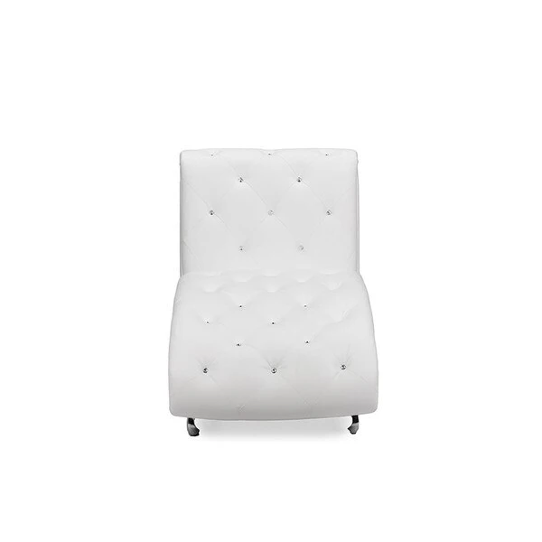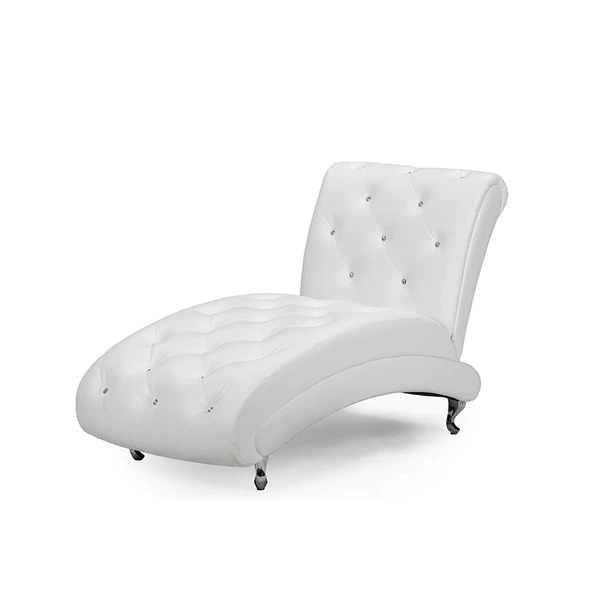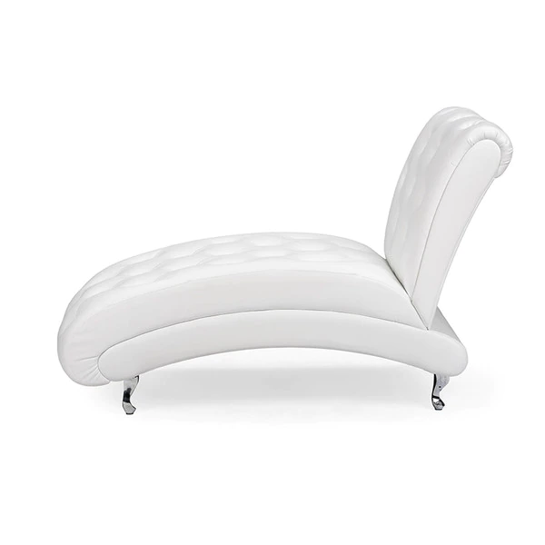 Extend your legs in comfort on this elegant chaise lounge. This Pease cotemporary white leather upholstered and crystal tufted chaise lounge features white faux leather upholstery and faux crystal buttons tufting that lends itself well to a variety of decor.