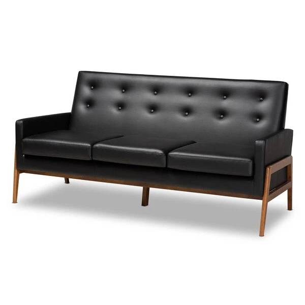 Add modern and comfortable seating to your space with the Perris sofa. Constructed from solid rubberwood, the Perris showcases clean lines and a low profile. Black faux leather upholstery provides a sleek look that complements the warm walnut brown finish on the frame. Wide, plush cushions provide ample seating comfort, while button tufting and angled legs lend a cool, retro look. Stylish and versatile, this sofa is well suited for both private living spaces and public reception areas. The Perris sofa requires assembly.