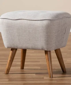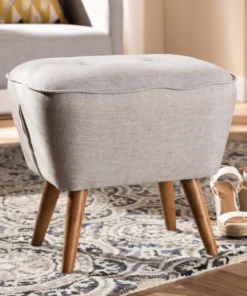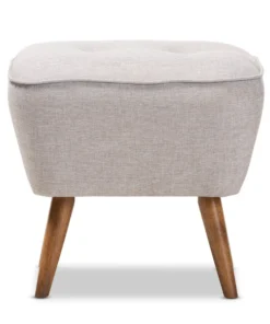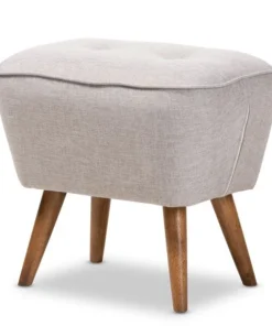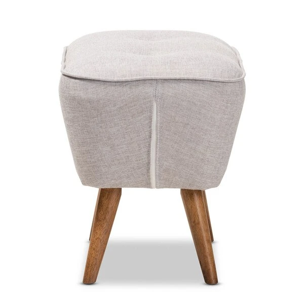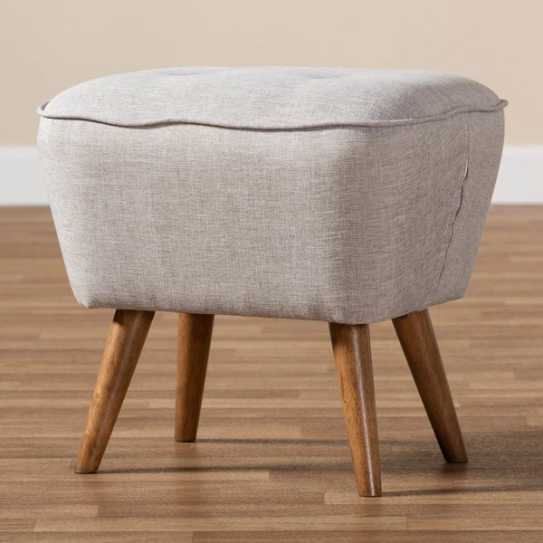 For an ottoman that is comfortable, stylish, and sturdy, choose the Petronelle ottoman. The angled silhouette and solid coloring are hallmarks of its mid-century modern-inspired design. The Petronelle features a generously foam-padded top with button-tufting and greyish beige fabric upholstery. The sturdy, solid rubberwood legs are finished in walnut brown. The Petronelle's legs are tapered, and angle out stylishly for a more unique look. Refresh your space with this ottoman, which can be easily coordinated with the existing decor in your livingroom, entryway, or other shared spaces. The Petronelle requires assembly.