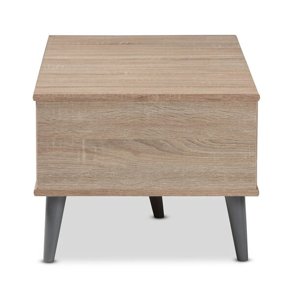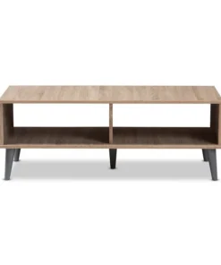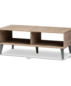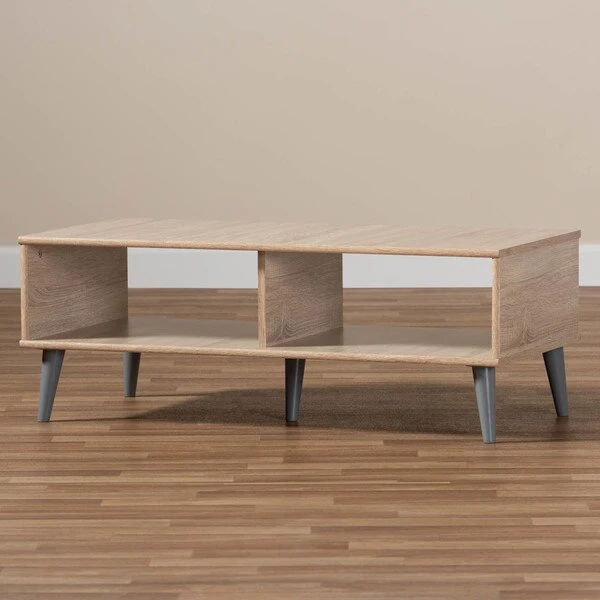 Add simplicity and style to your livingroom with the Pierre coffee table. The clean colors and angled, tapered legs of the table are clear hallmarks of its mid-century modern-inspired design. The Pierre's engineered wood frame is finished in a delightful oak and light grey two-tone color palette. The table features two open shelf spaces with a central divider, giving you many possibilities for storage and display of magazines, books, and decor. The Pierre's under clearance area makes it easy to clean underneath and around the table, making it a practical addition to your home. The color and minimalist design of the table make it easy to coordinate with your existing decor. The Pierre requires assembly.