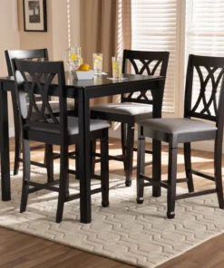 Exquisitely crafted, the Reneau 5-piece pub set adds elegance to any dining space. Constructed from wood, this pub set includes one table and four chairs, each upholstered in a light polyester fabric that complements the rich espresso wood finish. Designed with both comfort and style in mind, each chair features a plush foam-padded seat, as well as an exquisite cut-out design on its back. Tapered feet add a classic, refined touch. The compact size of the Reneau set makes it well suited for dining rooms and kitchens with limited space. The Reneau 5-piece pub set requires assembly.