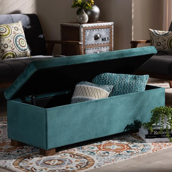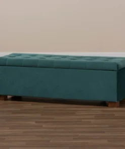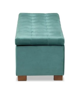 Perfect as a bed end bench for your bedroom or as an accent piece in your living space, the Roanoke storage bench combines handy seating and storage in a stylish way. Constructed solid rubberwood, the bench features a cushioned seat upholstered in a soft velvet fabric that adds a dose of glamour to your space. The elegant grid-tufted top opens to reveal ample storage space, while walnut brown legs create a strong foundation. The Roanoke storage bench requires leg assembly.