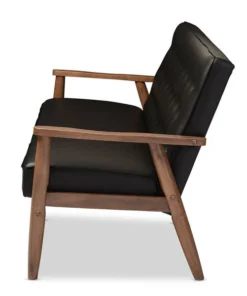 A simple, post-modern design that works well with a variety of styles, the Sorrento 3-seater sofa is upholstered in black faux leather with solid rubberwood legs and frame. The sculptural arms and wide, welcoming seat are a throwback to classic 1950s and 60s Danish design. A fully upholstered seat with exposed dark walnut wood looks great from all angles, whether in a lounge arrangement, public waiting area or private office. The splayed legs and button-tufting design add a retro modern touch to this piece of clean lines furniture. The Sorrento features light weight and easy handling. It will be suitable for those urban dwellers with limited space. It could be a cool-looking reading nook within 30 minutes of assembly out of a box. The Sorrento will be a standout piece in any modern interior.