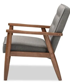 A simple, post-modern design that works well with a variety of styles, the Sorrento lounge chair is upholstered in grey fabric with solid rubberwood legs and frame. The sculptural arms and wide, welcoming seat are a throwback to classic 1950s and 60s Danish design. A fully upholstered seat with exposed dark walnut wood looks great from all angles, whether in a lounge arrangement, public waiting area or private office. The splayed legs and button-tufting design add a retro modern touch to this piece of clean lines furniture. The Sorrento also features light weight and easy handling. It will be suitable for those urban dwellers with limited space. It could be a cool-looking reading nook within 30 minutes of assembly out of a box. The Sorrento will be a standout piece in any modern interior.