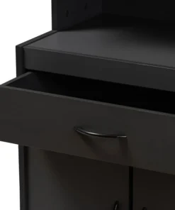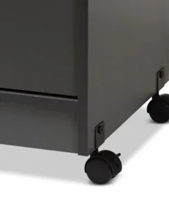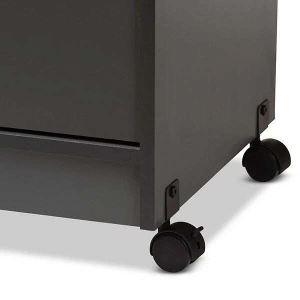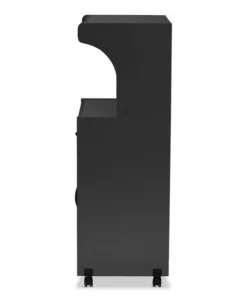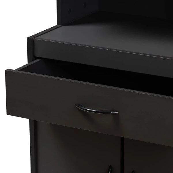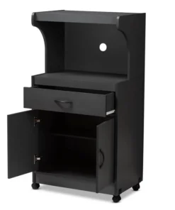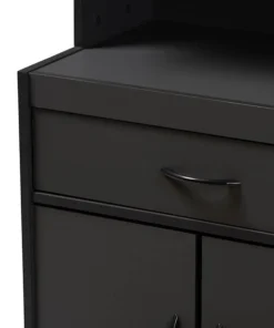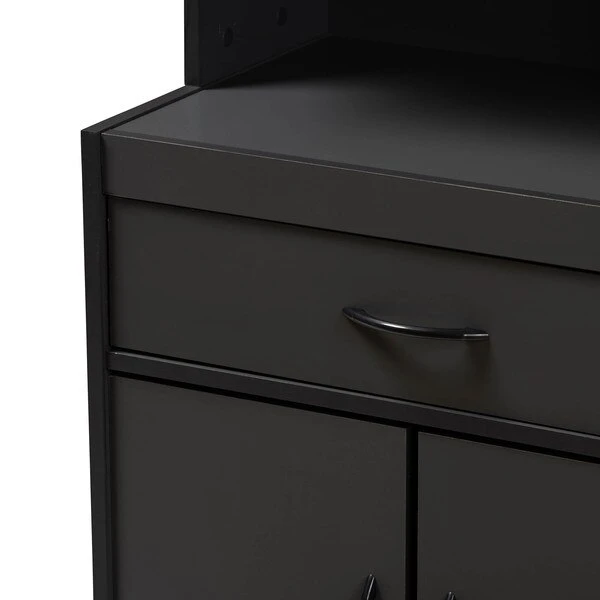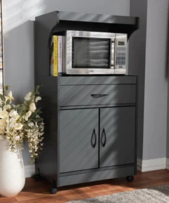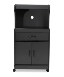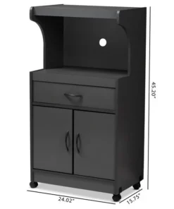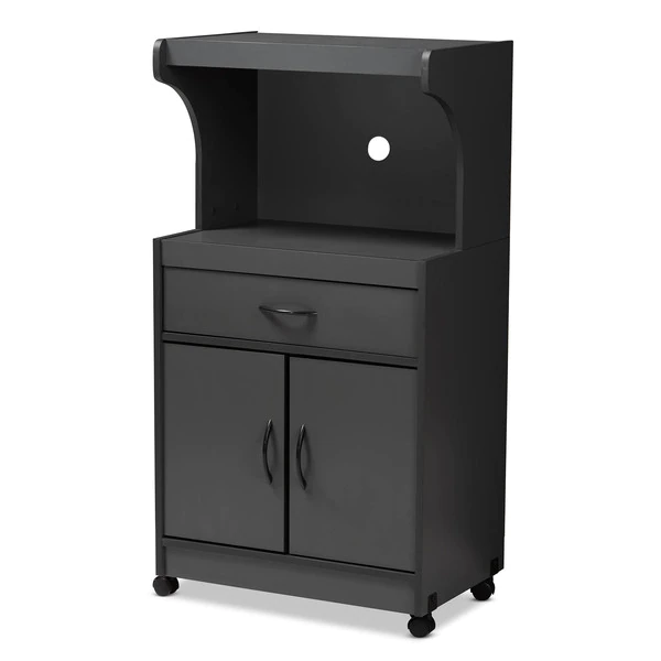 Practicality and minimalist style come together with the Tannis kitchen cabinet. The modern and contemporary-inspired design is clear to see in the rectangular silhouette and subtle grooved features. The Tannis's engineered wood frame is finished in a sophisticated dark grey finish. The cabinet features two shelf spaces behind discreet doors, and a drawer on top of them for additional storage. The Tannis's top compartment has ample space for a microwave, with a cut-out in the back panel for wire management. The drawer and door handles are finished in black to complete the sleek look. The Tannis comes with castors for mobility, so this cabinet can provide storage for utensils and dishware, and can be moved easily for cleaning. The kitchen cabinet requires assembly.
