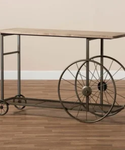 Add rustic charm to your space with the Terence console table. The Terence is comprised of a black finished metal frame fitted with a natural finished wood tabletop. A lower mesh metal shelf keeps various items on hand while organizing clutter. Requiring assembly, the Terence is fitted with decorative wheels that lend a unique, eye-catching aesthetic. Bring some vintage charisma to your space with the Terence console table.