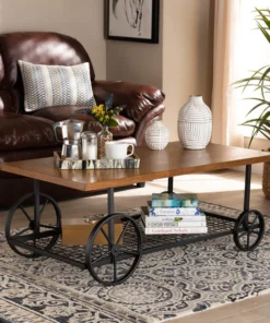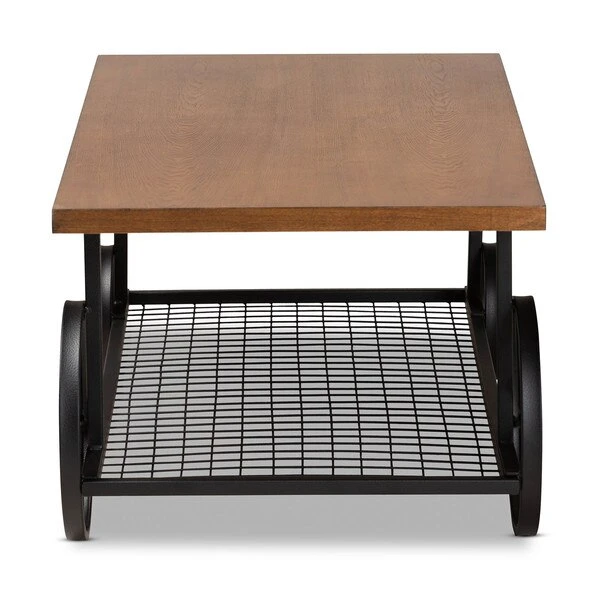 Add vintage industrial charm to your space with the eye-catching Ursa coffee table. The Ursa is comprised of a black finished metal frame fitted with a walnut brown finished wood tabletop. A mesh metal shelf provides space for books and magazines while also lending a cool, industrial look. Requiring assembly, the Ursa also features decorative wheels for added rustic character. Brimming with vintage personality, the Ursa coffee table is a stunning addition to any home.
