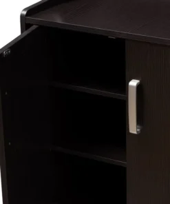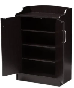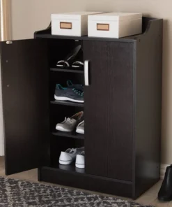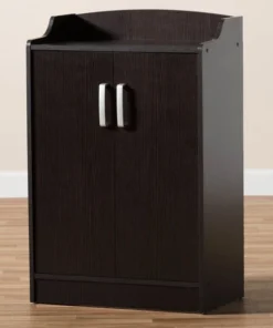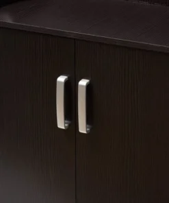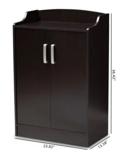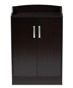 If you're looking for a simple solution to your storage and organization woes, then the Verdell shoe cabinet is for you. The modern and contemporary-inspired design is unassuming and easy to blend and coordinate with your existing decor. The Verdell is finished in a wenge brown and has silver-finished door handles. The shoe cabinet features four shelves discreetly placed behind two hinged doors with a magnetic closure, which can serve as a shoe rack or other entryway storage. The Verdell also features an open, top storage space with three sides. This shoe cabinet can help keep save space in your mudroom, entryway, and closets. The Verdell requires assembly.
