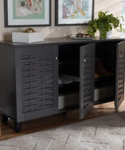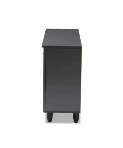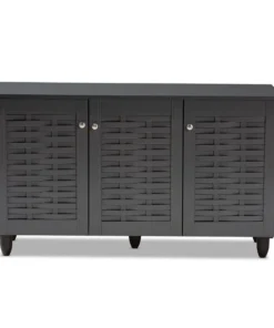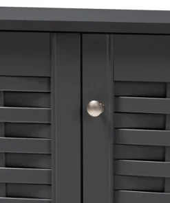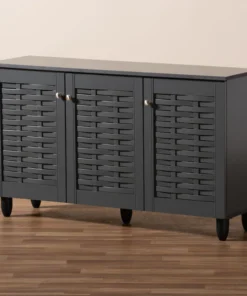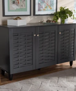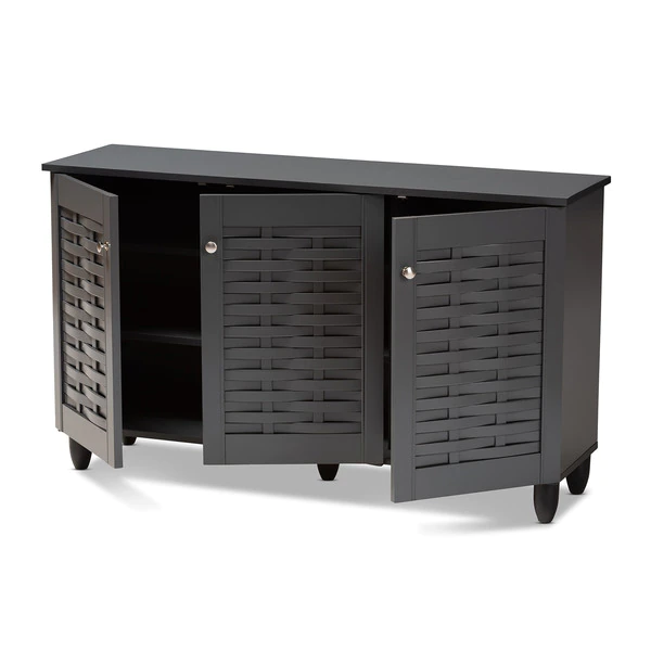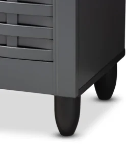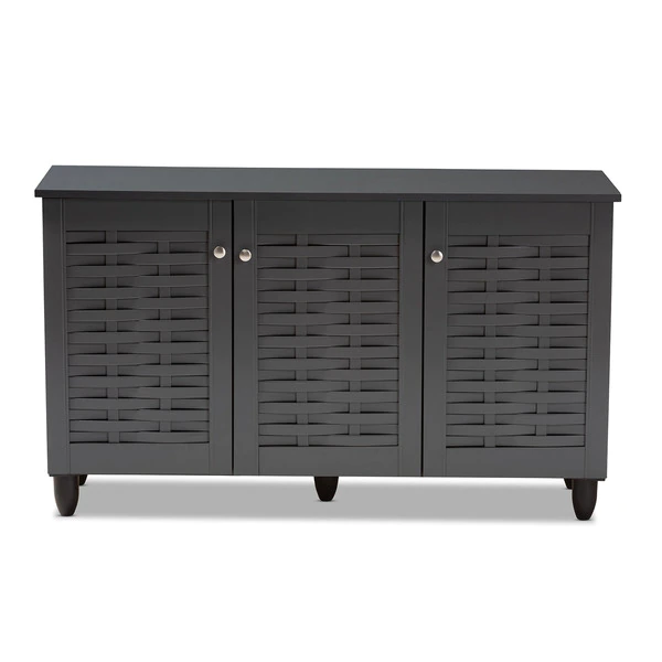 Keep your shoes organized and out of sight with the Winda cabinet. Featuring a stylish contemporary design and dark grey finish, the Winda is easy to coordinate with any style of decor. Three doors conceal four shelves with storage space for up to 12 pairs of shoes. Slits are embedded within the doors to enable air circulation and prevent mold growth on your shoes. The Winda cabinet requires assembly.