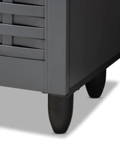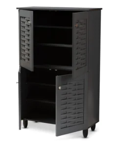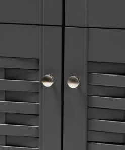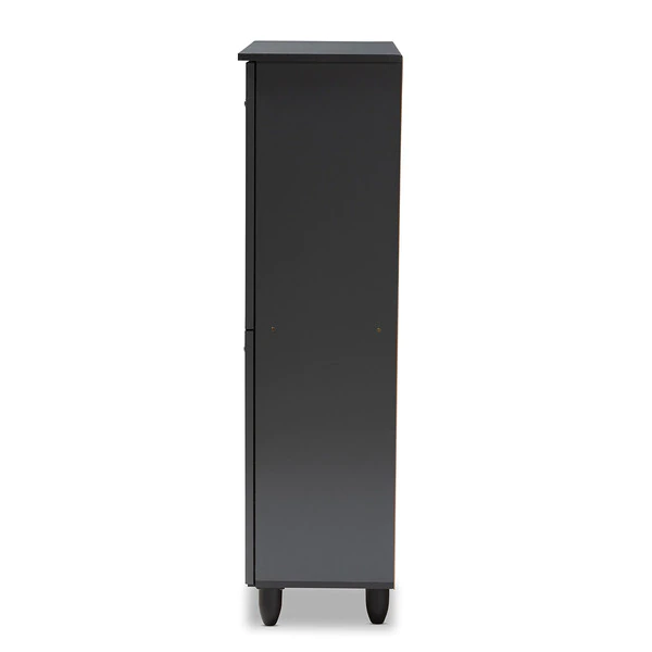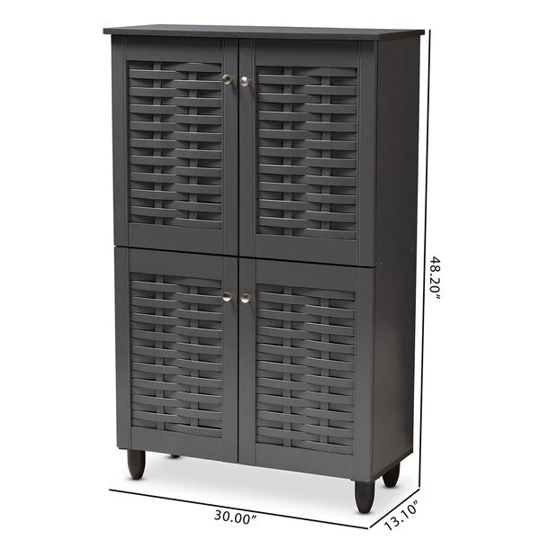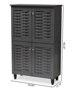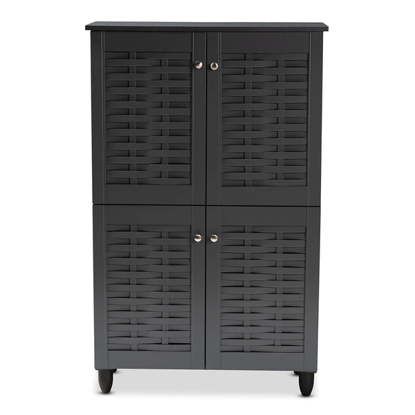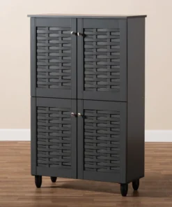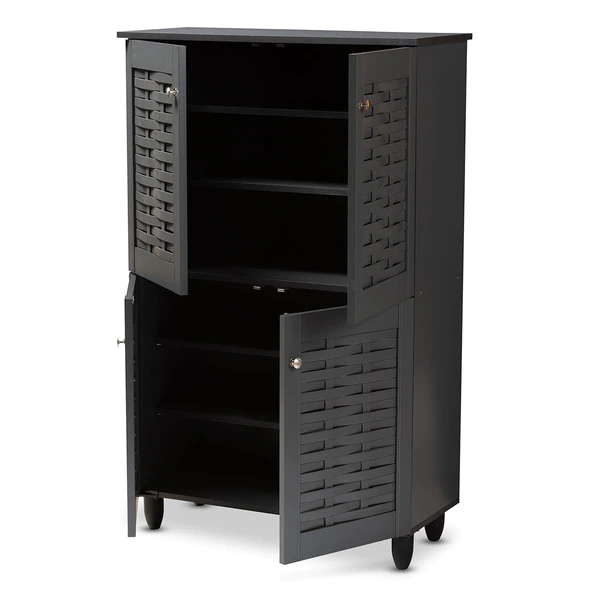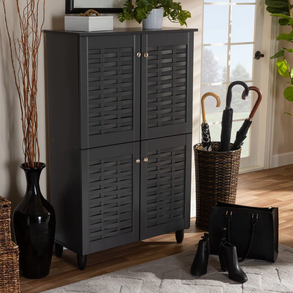 Keep your shoes organized and out of sight with the Winda cabinet. Featuring a stylish contemporary design and dark grey finish, the Winda is easy to coordinate with any style of decor. Four doors conceal four shelves with storage space for up to 18 pairs of shoes. Slits are embedded within the doors to enable air circulation and prevent mold growth on your shoes. The Winda cabinet requires assembly.
