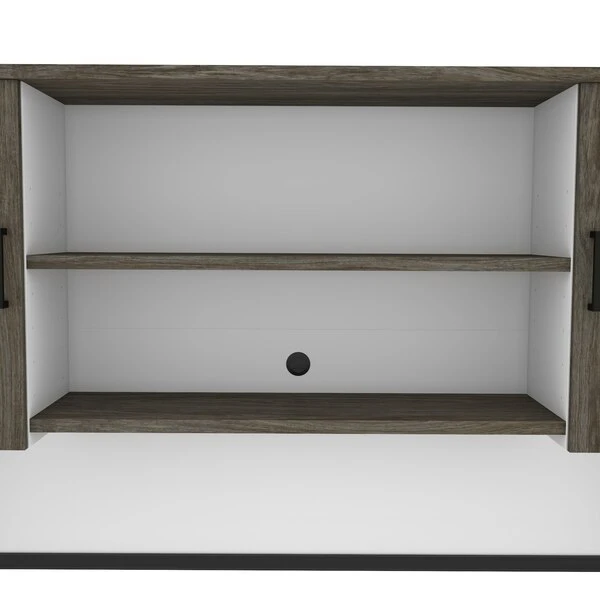 The Norma Collection is ideal for any type of office. You can easily arrange the pieces in this collection to fit your needs by adding a desk shell or a hutch. Keep your space organized with the multiple storage options. Not only will your space be clutter-free, it will also feel modern and stylish thanks to the two-tone design and the metal handles with black finish. Enhance your space with this affordable collection! Features 1 open storage compartment (38.8′′ W x 25.3′′ H x 10.6′′ D) with 2 adjustable shelves and 1 adjustable shelf behind each of the 2 doors. One grommet and a rubber strip for efficient wire management. Finished back. Made of laminated, high-density commercial-grade particle board, compliant with Carb phase 2. Meets or exceeds ANSI/BIFMA safety and performance standards. The top of the hutch and each shelf in the open storage area can support up to 25 lb.