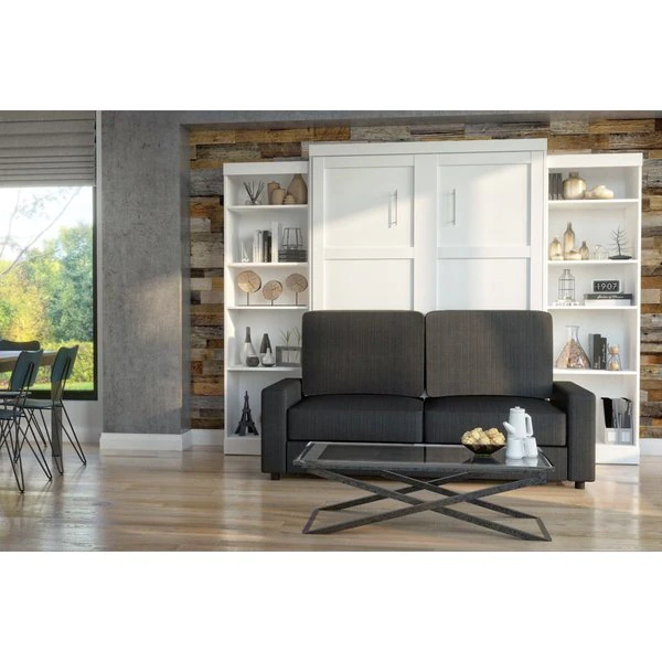 This set includes a Queen Murphy bed, two Storage Units and a SofaQueen Murphy bed, Two Storage Units and a Sofa (115") Combining style and convenience, Pur by Bestar is the perfect solution to furnished condos, lofts, studios, guest’s rooms and home offices. The collection brings multi functionality to a single room. The kit comprises a queen Murphy bed and two 25“ storage units. The mechanism provides simplified assembly of the Murphy bed. Increased comfort due to Euroslat mattress support system. Simple and safe dual piston system makes opening and closing user-friendly. Easy to use; use the handle to pull the bed towards you to lower the bed and flip the leg down onto the floor. Accommodates a standard queen mattress up to 12“ thick and weighing at least 70 lbs. Maximum dimensions of the mattress are 60“ X 80“. Mattress not included; Box spring not required. Front panel is installed as one of the last steps making the mounting to studs in a wall much easier. The minimum height required of the ceiling is 91 in. Clearance of 9. 4“ under the bed when it is open. Bed when opened will require a clearance of 101“. 2 fixed and 3 adjustable shelves in each storage unit to maximize your options. Shaker-inspired trim and metal handles on wall bed. Assembly required. Easy to install. Wall bed : 64. 6“ (W) x 20. 3“ (D) x 89. 1“ (H). 25‘‘ storage unit : 25“ (W) x 18. 2“ (D) x 83. 7“ (H). Sofa for Queen Murphy bed – fabric WE3QUALITY MATERIALS: Suspension is made with 9-gauge sinuous coils. Seat cushions are filled with non-glue cotton covered with D30 foam. 2” high plastic or chrome legs. Hardwood frame. SPACE-SAVER: The sofa and murphy bed combination is the perfect solution for making the most out of your space. It offers both a place to sit and a place to sleep in very little space. To fold out the bed, simply remove the cushions and lower the bed. COMPATIBLE: The sofa can be used as an add-on to any of Bestar’s Queen Murphy bed. Alternatively, it can be placed against a wall. You can choose either plastic or chrome legs. COMFORTABLE: The seat cushions are 7. 9” thick. All fabrics have a heavy duty backing. No nails are used, only staples. NOTE: Pre-assembled, except the legs. Overall dimensions: 78” W x 33. 5” D x 39” H. Must be placed against a murphy bed or a wall to support the back cushions. Cannot be placed in the