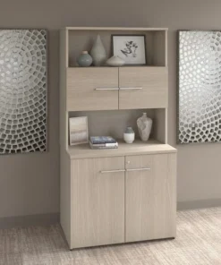 With its combination of open and closed storage, the Bush Business Furniture Office 500 Bookcase Hutch is a perfect way to keep any workspace in order while showcasing the style and personality of today's professional. This 36W Hutch attaches to the coordinating 36W 2 Drawer Lateral File Cabinet or 36W Storage Cabinet with Doors (sold separately) for a complete organization solution. Two open shelves offer plenty of space to brighten up the room with your favorite books, pictures, awards and decorations. A small cabinet conceals unsightly supplies and reference materials while keeping them easily accessible when you need them. Each shelf supports up to 50 pounds, so you can store and display larger items with confidence. Your choice of Black Walnut, Sand Oak, Modern Hickory and Storm Gray finishes with Light Silver hardware make it easy to find the right look for any professional environment. This durable bookshelf Hutch is tested to meet ANSI/BIFMA quality standards for safety and performance. See the full collection for coordinating items available.
