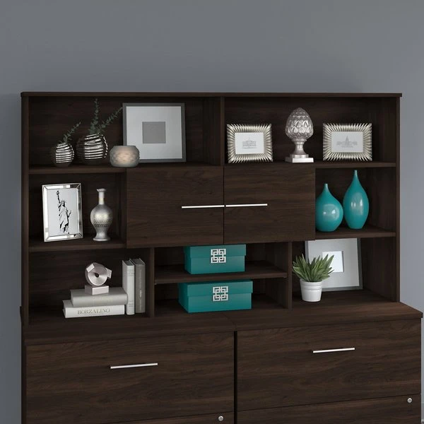 With its combination of open and closed storage, the Bush Business Furniture Office 500 Desk Hutch is a perfect way to keep any workspace in order while showcasing the style and personality of today's professional. This 72W Hutch attaches to the coordinating 72W x 24D Credenza Desk, two 36W 2 Drawer Lateral File Cabinets or two 36W Storage Cabinets (coordinating items sold separately). Open cubby spaces on the right and left offer plenty of room to display pictures, professional achievements and other decorations while the large top shelves are ideal for organizing a collection of books. The center of the Hutch features a small storage cabinet that keeps office supplies and reference materials out of sight but easily accessible. Below the cabinet is an adjustable shelf that can be used to store work-in-progress or small electronic devices like a laptop or tablet. Your choice of Black Walnut, Sand Oak, Modern Hickory and Storm Gray finishes with Light Silver hardware make it easy to find the right look for any office environment. This durable Desk Hutch is tested to meet ANSI/BIFMA quality standards for safety and performance. See the full collection for coordinating items available.
