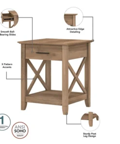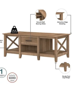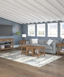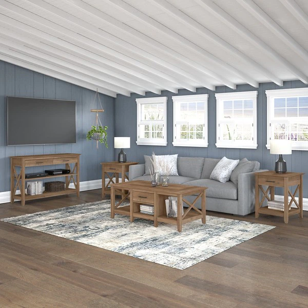 The Bush Furniture Key West Coffee Table with Console Table and Set of 2 End Tables is a perfect way to bring the feel of a coastal retreat right to your living room. Highlighted by unique X pattern accents and your choice of several casual finishes, this table set is a natural fit in homes that embrace cottage and farmhouse styling. Each side of the low Coffee Table features a box drawer above an open cubby space for organizing books, magazines and other miscellaneous items. Larger compartments to the right and left offer plenty of room for decorations or additional storage. The side tables also include a drawer for small accessories like TV remotes, writing utensils and notepads while the surface easily supports a lamp, plant or pictures. The versatile Console Table adds two drawers for household supplies and two shelves for even more open storage and display capacity. The bottom shelf is fixed for stability, and the upper shelf can be raised or lowered to accommodate materials and decor of various sizes. This living room table set has been rigorously tested to meet Bush Furniture's standards for safety, performance and durability and is backed by a . Browse the full Key West Collection for home furnishings with easy going style, including a Tall TV Stand to complete your living room furniture set (coordinating items sold separately).