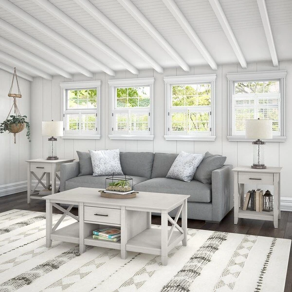 The Bush Furniture Key West Coffee Table with Set of 2 End Tables is a perfect way to bring the feel of a coastal retreat right to your living room. Highlighted by unique X pattern accents and your choice of several casual finishes, this table set is a natural fit in homes that embrace cottage and farmhouse styling. Each side of the low Coffee Table features a box drawer above an open cubby space for organizing books, magazines and other household items. Larger compartments on the right and left offer plenty of room for decorations or additional storage. The side tables also include a small drawer for TV remotes, writing utensils and more. A lower shelf provides even more storage and display capacity while the surface easily supports a lamp, plant or pictures. This living room table set has been rigorously tested to meet Bush Furniture's standards for safety, performance and durability and is backed by a . Browse the full Key West Collection for home furnishings with easy going style, including a Console Table with Storage and Tall TV Stand for a complete living room furniture set (coordinating items sold separately).