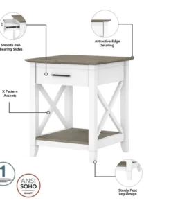 The Bush Furniture Key West End Table with Storage is a perfect way to bring the feel of a coastal retreat right to your living room. Highlighted by its unique X pattern accents and your choice of several casual finishes, this small side table is a natural fit in homes that embrace cottage and farmhouse styling. A box drawer organizes writing utensils, notepads, TV remotes and more while the lower shelf is perfect for storing reading materials and other household items. The surface offers more than enough room for a lamp, plant or decorations that give your space a personal touch. Use the 20W x 20D x 24H End Table on its own or build a complete living room furniture set with the matching Key West Coffee Table, 60W TV Stand and Console Table (coordinating items sold separately). This accent table has been rigorously tested to meet Bush Furniture's standards for safety, performance and durability and is backed by a . Browse the full Key West Collection for home furnishings with easy going style.