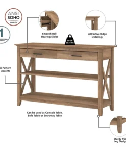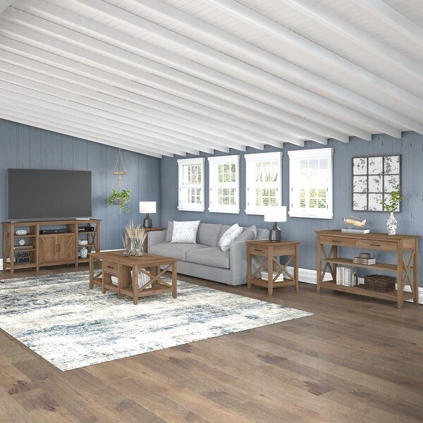 The Bush Furniture Key West Tall TV Stand with Coffee Table, Console Table and Set of 2 End Tables is a perfect way to bring the feel of a coastal retreat right to your living room. Highlighted by X pattern accents and your choice of several casual finishes, this furniture set is a natural fit in homes that embrace cottage and farmhouse styling. Get together for movie night or catch up on your favorite show around an entertainment center that supports up to a 65 inch TV and/or 75 pounds. An upper shelf with cable management provides a place for components while the cabinet and open storage areas accommodate movies, video games and other media. Each side of the low Coffee Table features a box drawer above an open cubby for organizing books and magazines. Large compartments to the right and left add plenty of space for decorations or additional storage. The side tables also include a drawer for small accessories like TV remotes, writing utensils and notepads while the surface easily supports a lamp, plant or pictures. The Console Table has two drawers for household supplies and two shelves for even more open storage and display capacity. The bottom shelf is fixed for stability and the upper shelf can be adjusted to accept materials and decor of various sizes. This living room table set has been rigorously tested to meet Bush Furniture's standards for safety, performance and durability and is backed by a .