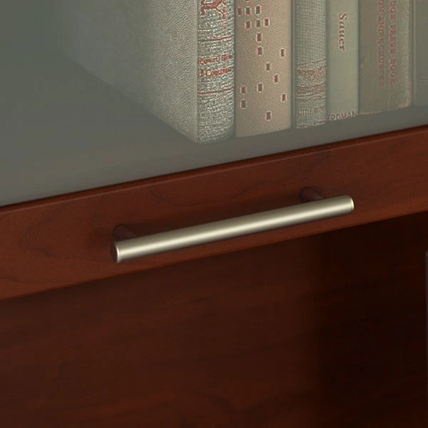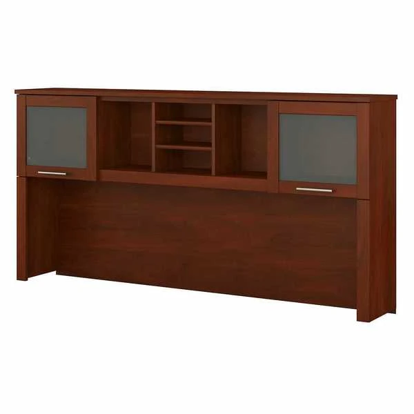 The Bush Furniture Somerset 72W Hutch offers the storage and display capacity you need to complete your beautiful and functional home office. The Hutch mounts securely on either side of the coordinating L Shaped Desk or 72W Office Desk with Drawers (both sold separately) for a customizable workspace solution. Storage options include large open compartments that are perfect for books, binders or decorations and two shelves to hold work-in-progress. A pair of frosted glass doors provides concealed storage to eliminate visual clutter. Transitional styling includes contemporary metal hardware and your choice of several attractive finish options for an alluring home office design that works with your existing decor. This 72-inch Desk Hutch is tested to meet ANSI/SOHO quality standards for safety and performance. See the full line of coordinating items from the Somerset Collection to expand your home office in style.