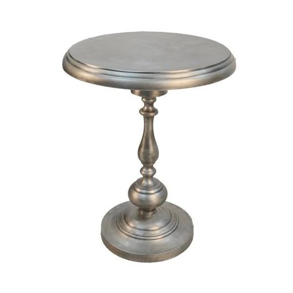The Pearson Accent Table is a pedestal-style accent table with many attributes. This hand forged metal accent table has an antique nickel finish that is warm and inviting. Place this side table beside your couch or bedside. and show off its unique design. SpecificationsColor: SilverMaterial: MetalShape: RoundStyle: GlamAssembly Required: YesFinish: Antique Nickle FinishDimension: 24" H x 18.5" W x 18.5" LWeight: 14 lbs