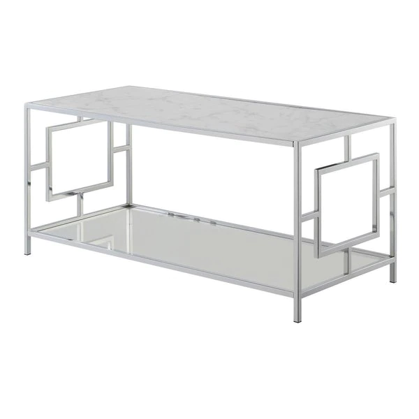 Complete your luxurious setup with the Town Square Chrome Coffee Table by Convenience Concepts. This contemporary table will bring glamour and functionality anywhere it stands. Showcasing two tiers of spacious shelves crafted from tempered clear glass and faux marble. The chrome metal frame boasts an open concept design and a geometric silhouette. The removable shelves make it easy for maintenance. Simple and easy assembly in just 3 steps will have you admiring your glamourous setup in no time. Look for coordinating pieces from the Town Square Chrome Collection from Convenience Concepts. FeaturesClassic and Contemporary StyleCrafted from MDF. Tempered Clear Glass. and Chrome MetalEasy Assembly Requiring Only 3 Easy StepsPart of the Omega CollectionSpecificationsDimension: (L) 42 x (W) 18 x (H) 18 in.Weight: 46 lbs