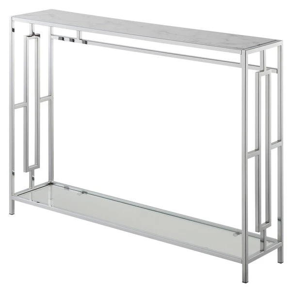 Add sparkle to your home and witness the room come to life as you decorate your Town Square Chrome Console Table from Convenience Concepts. Utilize the versatility of this item and place it in any room. including the hallway. entry way and more. This console boasts two tiers of open shelving. a geometric side framework and a chrome metal frame. Show off your decorative items thanks to the open-concept design that this sturdy. multifunctional table offers. This is a must have piece to create the ultimate display stage for collectible and mementos. Enjoy in no time with easy assembly requiring only 4 easy steps. Look for coordinating pieces from the Town Square Chrome Collection from Convenience Concepts. FeaturesClassic and Contemporary StyleCrafted from MDF. Tempered Clear Glass. and Chrome MetalEasy Assembly Requiring Only 4 Easy StepsPart of the Omega CollectionSpecificationsDimension: (L) 42 x (W) 9.25 x (H) 30 in.Weight: 30 lbs