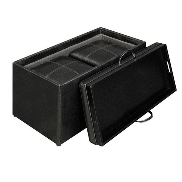 Loads of storage space with seating. Remove the top to reveal 2 side ottmans. Turn the top over to find built in hardwood serving tray with cut out handles.Fully AssembledStorage Bench with Two Side OttomansBuilt in Hardwood TrayFaux Leather Surface Will Provide Years of enjoymentDimensions: 35.25L x 17.75W x 17.75H Weight: 34 lbs.