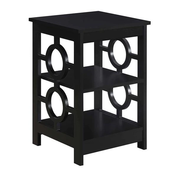 Unique and stylish;; the Ring End Table by Convenience Concepts will bring your home decor to the next level. This contemporary piece displays a well thought out construction that combines a clean lined silhouette and two circle cut outs that adorn each of the side frames. It also features three ample shelves for all your storage and display needs. Showcase your favorite books or store your living room essentials;; or why not do both! The versatility of this three tier unit is limitless. The shelves were crafted from particle board that is finished with melamine and non lead based paint;; making them easy to clean. Frames and legs were fashioned from particle board and finished with non lead based paint;; making them sturdy and long lasting. Add to your living room;; entryway or to your den;; and witness as this item enhances your current decor. Bring home today and enjoy its simple and fast 5 step assembly! They come in multiple finishes;; ensuring the perfect fit for your home. FeaturesPart of the Ring Collection by Convenience ConceptsUpgrade your home decor with this contemporary styleParticle board/MDF/Melamine/Non-lead based paintSimple and fast assembly requiring only 5 steps!Assembly RequiredSpecificationsFinish: BlackDimension: 15.75" L x 15.75" W x 24" HWeight: 22 lbs