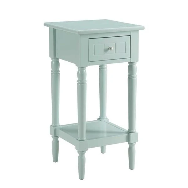 FeaturesTurned legs with sculpted accentsEngraved design on drawerBottom shelf for additional storageSolid pine legsTurned legs with sculpted accentsEngraved design on drawerSpecificationsColor: Sea Foam GreenCollection: French CountryMaterial: MDFDimension: 28.25 H x 14.25 W x 14.25 D in.Weight: 20 lbs