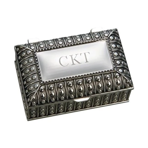 We started as a silver plated giftware company and over the years we have expanded our assortment to include non-tarnish metal. crystal. leather. glass and wood items. Our products are made from top grade material and equipment. P. unique and special.This vintage style rectangular 2.25" x 3.5" box is plated with an antique silver finish and coated with lacquer to prevent tarnishing. The cover is hinged. and the inside cover and bottom of the box are lined with a dark blue flocked cloth. The center of the cover is not decorated. which allows you to have a monogram engraved to personalize this gift. The box has a beaded design on the bottom portion and a beaded design surrounding the plain center on the cover. Silver gift box. SpecificationsShape: RectangleMaterial: Silver PlatedSize: 2.25 x 3.5 in. Weight: 1 lbs