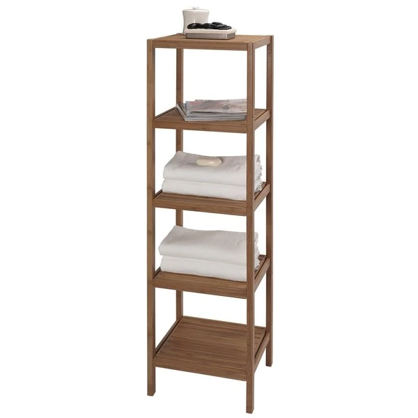 Five shelf tower. Exquisitely detailed and and crafted of environmentally sound Bamboo material. Decorative and functional storage and organization for any room in the home. Our natural Eco Styles Home Collection is made of bamboo with an innovative tongue and groove look and design. Transitional series covers most wanted items in storage for bath, bedroom, den, kitchen, laundry room, home office….. . Easy care. Wipe clean with soft damp cloth. 14.5" x 13" x 53.5"H
