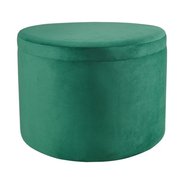 The Linder Storage Ottoman has a drum shape and a brass metal band around its base. A small ridge at the top reveals an inner storage area. Every room benefits from a chic upholstered storage piece like this Ottoman, which doubles as a side table or extra seating.