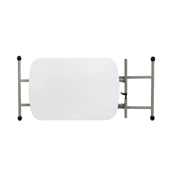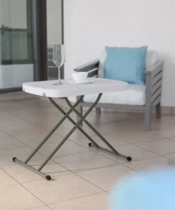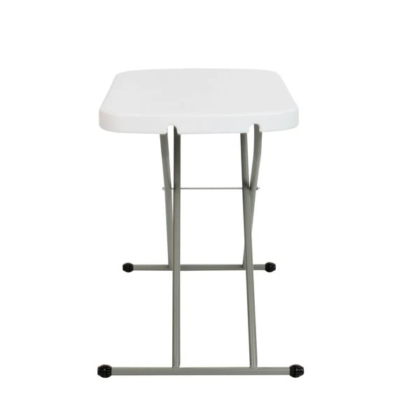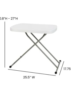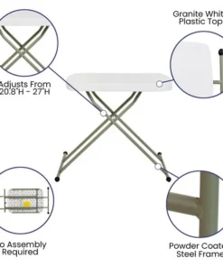 If you need extra surface space in your office cubicle, classroom, training room, dorm room, or in the home, this adjustable height personal folding table may be just what you're looking for. The granite white top gives a clean and tidy appearance to any space and adjusts from 20.8"H to 27"H to accommodate a variety of tasks. Pick one of the three height adjustment grooves and raise the tab to lock the frame in place. Lightweight for easy transport and suitable for indoor/outdoor use, this commercial grade table would be an excellent addition to any space. Use this handy piece as a laptop table while sitting on the floor to craft your term paper, a TV tray to watch your favorite show during dinner, or as a companion desk in your workspace without worry. Welded joints, metal screw construction and a gray powder coated steel frame provide a stable base to support up to 50 lbs. static weight capacity. The high density polyethylene top is ultra-strong and durable and does not break down from sun exposure so it's ideal for camping or tailgating. This multi-use side table needs no assembly and folds flat for convenient storage and transportation. A water based cleaner quickly cleans up spills and removes dust. Fixed plastic floor glides will prevent damage to your hard flooring surfaces.