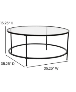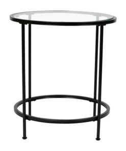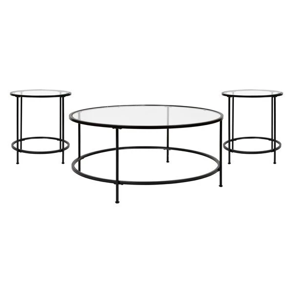 Lend any space in your home a sophisticated, polished look with this 3 piece clear glass coffee table set with matte black steel legs. This living room table set successfully marries the beauty of glass with the strength of steel that makes a definite statement. The round tops and frames contrast with the vertical legs to provide a contemporary look that's sure to tie any trendy room's presentation together. Whether you have a spacious modern home or a one bedroom apartment this round coffee table set will fit right in. The round design is perfect for an L-shaped sectional in the living room, two wingback chairs in the den or with the sofa in the family room. Not only does the ample surface area serve as a convenient space for holding belongings, it's also great for displaying magazines, newspapers, and keepsakes. Glass offers a distinctive, upscale look while providing superior strength that won't break even after heavy-duty use. Move these on-trend tables anywhere you wish without having to worry about scratches on your floors. Fixed floor glides prevent damage to your flooring and enable easy movement. Quickly remove dust or spills with a water based cleaner to keep these striking pieces looking brand new.