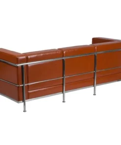 Your office reception space speaks to who your are as a company and this cognac LeatherSoft upholstered sofa with encasing frame makes quite a statement. This trendsetting piece features a straight arm design and 3 removable square seat cushions, all padded with 5" of foam for exceptional comfort. LeatherSoft is leather and polyurethane for added softness and durability. A stainless steel frame, accent bar enclosure and integrated legs give this chair added strength and a distinctive flair. Make a great impression on your clients, customers, and guests with this innovative contemporary chair. This progressive style chair brings comfort and trend-setting style to your waiting room, reception area or home.