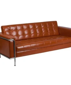 Your office reception space speaks to who your are as a company and this cognac LeatherSoft upholstered sofa with encasing frame makes quite a statement. This trendsetting piece features a straight arm design, and foam filled, tufted, fixed back and seat cushions for exceptional comfort. LeatherSoft is leather and polyurethane for added softness and durability. The integrated stainless steel frame and exposed accent bar not only add style, they are rust resistant and will keep up with the rigors of commercial use. Make a great impression on your clients, customers, and guests with this innovative contemporary sofa. This progressive style seating brings comfort and trend-setting style to your waiting room, reception area or home.