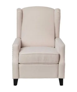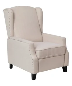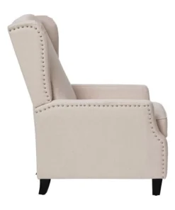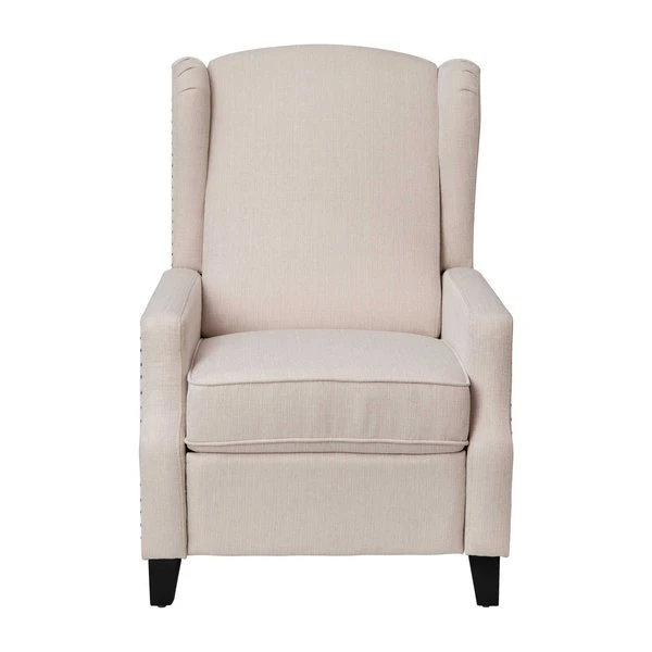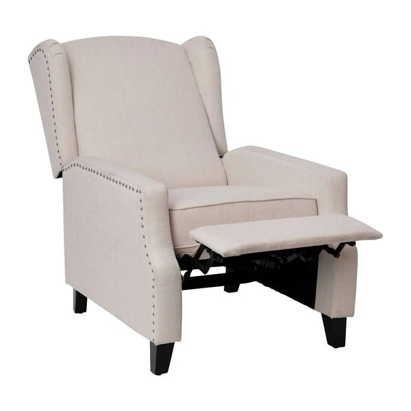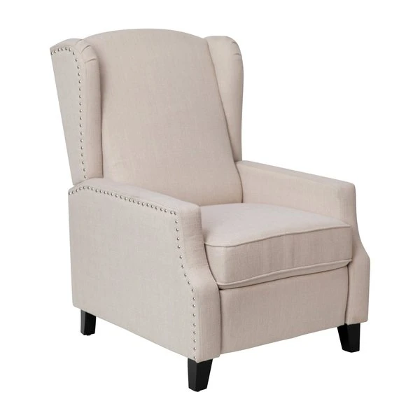 Old school tradition meets modern sophistication in this newly designed slim silhouette push back recliner. Featuring cream polyester fabric upholstery, straight arms, and accent nailhead trim, this living room recliner is just right for refreshing your space or furnishing a new home. High legs in a wood grain finish complete the look of this wingback chair and make floor cleaning easier. Beauty may be only skin deep but this reclining chair is more than a pretty face. A solid plywood core and steel frame with metal screw reinforcements ensure a worry-free seating experience while the generously padded pocket spring seat provides comfort. Simply place your hands on the arms and push backwards letting your weight recline the back and raise the footrest. Assembly of your new recliner requires no tools and takes less than 10 minutes with the included illustrated assembly instructions. Spot clean with water and a neutral detergent to maintain the chairs appearance. Fixed plastic floor glides will prevent damage to your hard flooring surfaces if you bump the chair or choose to move it.
