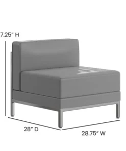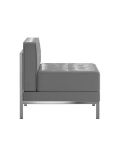 Moving your furniture around is a quick and easy way to change up the look and feel of your space so modular pieces like this gray LeatherSoft upholstered middle chair are a must have. LeatherSoft is leather and polyurethane for added softness and durability. This modern armless chair gives an upscale, sophisticated look to any space and can be used in conjunction with other pieces or as a standalone. Exposed stainless steel and LeatherSoft upholstery master the art of mixed media giving you a distinctive look your guests and clients are sure to appreciate. As your business grows, you can add on more pieces and reconfigure your design. This innovative contemporary chair will bring comfort and trend-setting style to your waiting room, reception area or lounge.