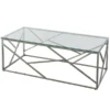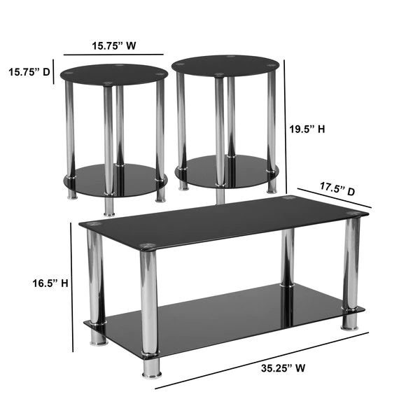 Do something a little different with the fresh look of this 3 piece coffee table set. Black glass forms the top and lower shelf of each piece in this coffee table set. Cylindrical stainless steel legs are polished to a high shine. For a change of pace, the coffee table is rectangular, and the end tables are round. This sleek looking table set offers a design that will look great in any room. Bottom shelves give extra real estate for displaying decorative items or photos. This distinct set will meet all of your needs for displaying and holding your common living room items.