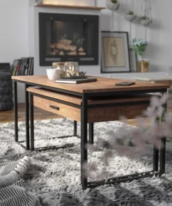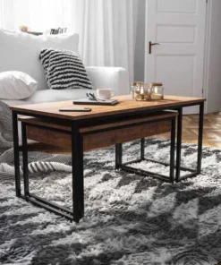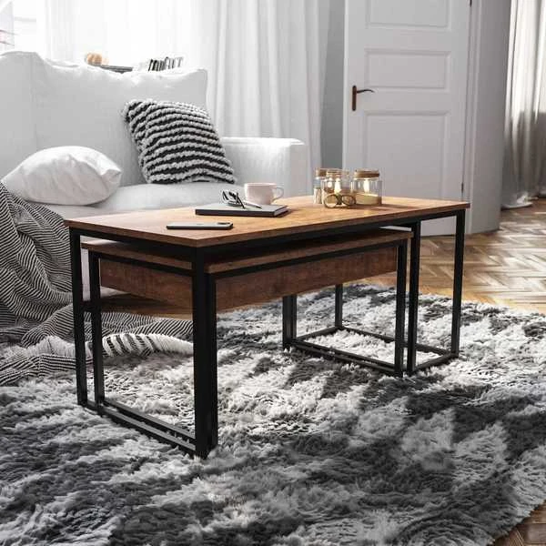 If you're looking to refresh your home or business and want style as well as function you can't go wrong with this set of 2 nesting coffee tables. Not only are nesting tables on-trend and gorgeous, but you also get some much needed horizontal real estate. These tables can be used in multiple areas so whether you're furnishing a compact living space or a large hotel lobby this table set can be configured to meet your needs. A storage drawer featuring ball-bearing glides can keep remote controls out of sight at home or hold extra pamphlets and pens in your office reception area. Strength and durability are paramount in any piece of furniture. Engineered wood tabletops in a smooth walnut finish are perched atop powder coated black steel tube sled style frames with metal screw reinforcements. Each table accommodates up to 100 lbs. static weight capacity. Assembly of your new nesting table set takes 30 minutes or less with included materials. Maintain the appearance of these tables easily by wiping with a dry cloth to remove spills and dust. Adjustable plastic floor glides protect your hard flooring surfaces.