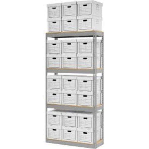RECORD STORAGE OPEN WITH BOXES 42"W X 15"D X 84"H – 130111 RECORD STORAGE CENTER RUGGED, ROOMY 200 TEST CORRUGATED TRANSFER FILE WITH DOUBLE-THICK FRONT/BACK WALLS HELP KEEP RECORDS PROTECTED AND NEATLY ORGANIZED…KEEPS OUT DUST AND DIRT. LARGE PRINTED LABEL AREA FOR QUICK IDENTIFICATION OF CONTENTS AND HAND HOLES FOR EASY HANDLING. BOXES STORE SECURELY ON RUGGED 5/8" THICK PARTICLEBOARD DECKS. HEAVY-GAUGE STEEL RACK ASSEMBLES WITHOUT TOOLS.