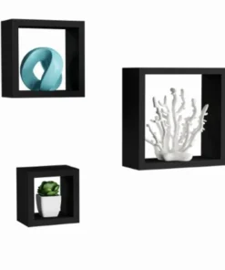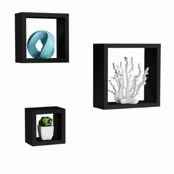 Style and function truly align with the Hastings Home Floating Cube Wall Shelf Set. The mounting hardware is concealed behind a sleek, straight shelf to give the floating appearance and bring a modern look to any home. The cubed shelves in 3 graduated sizes are perfect to stylishly display your favorite books, decorative accents, photos, trophies, keepsakes, collectables and more. The versatile shelving can be used in the bathroom for toiletries, in the kitchen for spice jars, in the bedroom, living room, dining room, or are even great to fill in empty wall space above a desk, entryway, vanity and more! Made from durable MDF wood, each shelf comes preassembled and features pre-drilled keyholes and mounting screws and anchors for easy installation. The unique design allows you to either display items inside or on the ledge of the cube, and offers a perfect way to add texture and customization to your home wall gallery!