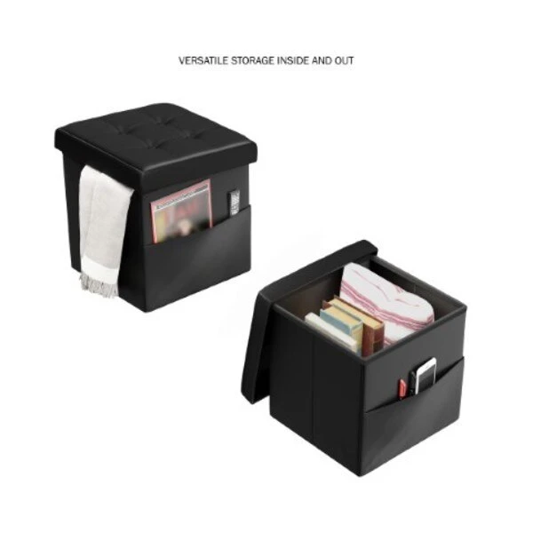 Bring the best of style and function to your home with the Tufted Faux Leather Foldable Storage Ottoman with Pocket by Hastings Home. This cube features a premium, faux leather vinyl that is both easy to clean with a soft, damp cloth and stylish. The modern, clean lines bring a chic style to your home. The ottoman is constructed from sturdy MDF material to give it a 330-pound weight capacity as a seat and 30-pound capacity as a storage cube. The convenient exterior pocket keeps essentials within easy reach, and the tufted, cushioned top with foam padding provides a comfortable seat. The collapsible design makes it easy to set up in seconds! It can be folded flat when not in use for convenient storage, making it ideal for dorms, RVs and small apartments. This multipurpose cube is great to use as a foot rest, bed stool, toy chest and more. It makes a wonderful stylish addition to any bedroom or utility room while keeping your belongings organized.