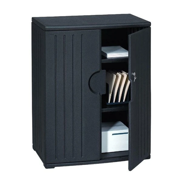 Cabinet offers lockable doors for security and double walls for stability. Generous storage capacity holds equipment, books, binders or office supplies. Storage cabinet is made of durable, dent-resistant, scratch-resistant, blow-molded, high-density polyethylene. Material is easy to clean and resistant to chemicals.