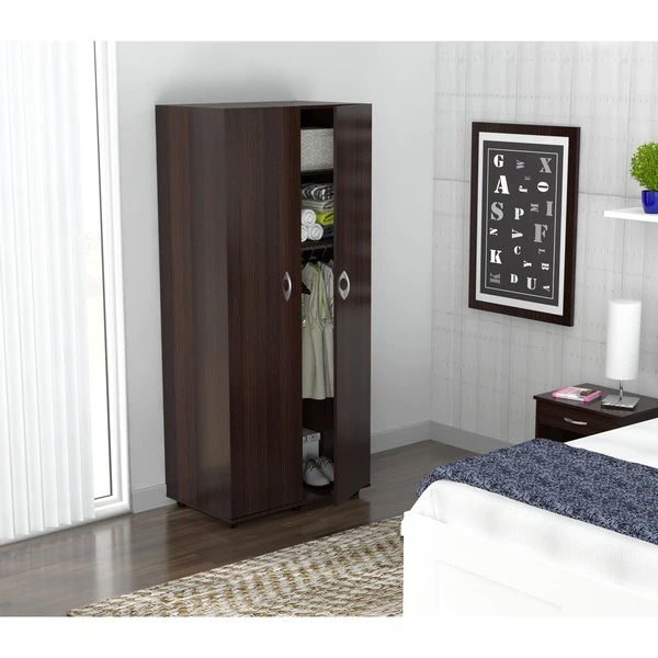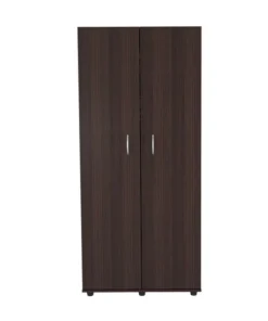 Wardrobe/Armoire by Inval® finished in a rich “Espresso” laminates in durable melamine which is stain, heat and scratch resistant. Constructed from manufactured wood The unit has a functional design and is an excellent choice for your home or home office. It features two doors with brushed chrome metal handles, a hanging bar that provides spacious area for hangers and two top shelves for additional storage. The unit sits on four plastic floor gliders for easy repositioning.