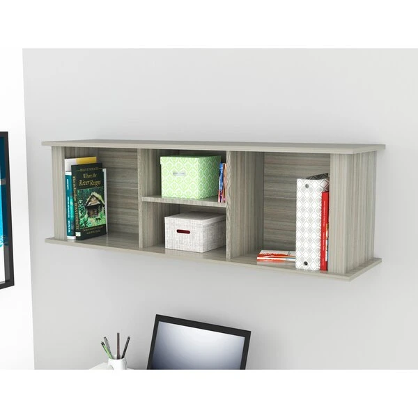 Wall-Mounted Hutch by Inval® finished in a rich “Smoke Oak” laminates in durable melamine which is stain, heat and scratch resistant. This wall mounted hutch has a functional modern design and is an excellent choice for home office or office. It features two horizontal shelves in the center and vertical storage area on each side providing ample storage space.
