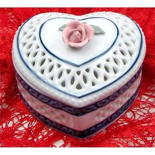 FeaturesPorcelain hear shaped box perfect for those treasuredWoven Porcelain Heart BoxDimension – 4 W x 3 H x 3.75 D in.
