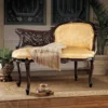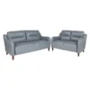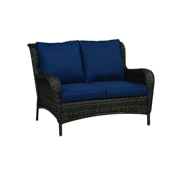 Style and substance unite in this breezy collection. Navy blue olefin cushions pop on the dark brown/gray wicker overlaying a steel frame chair glider chair loveseat and sofa. A faux wood slat top accents the coffee and side tables.